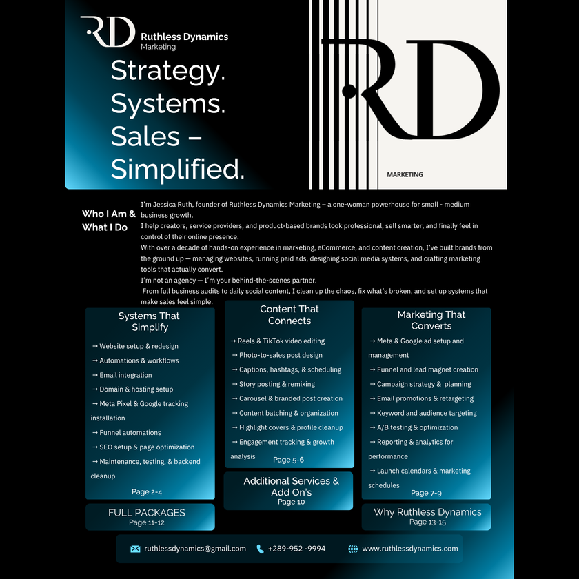 I’m Jessica, the founder and creative strategist behind Ruthless Dynamics — a full-service marketing, design, and business systems brand built for real small business owners who want results, not guesswork.